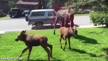 Mamá Alce con sus dos crías jugando en un aspersor de jardín