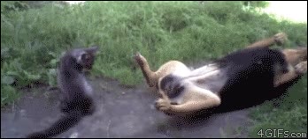 El perro ha encontrado la manera de evitar al gato, ignorarle a pesar de los zarpazos